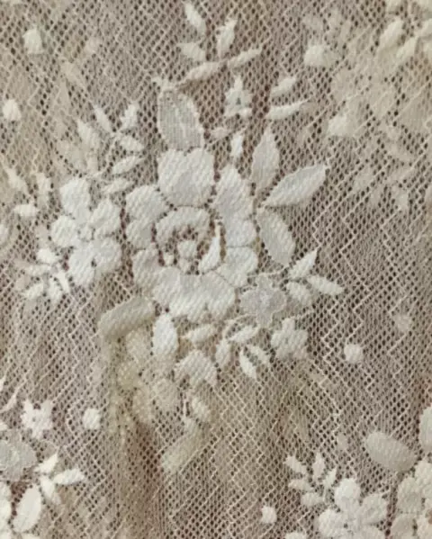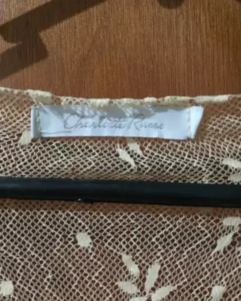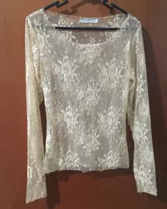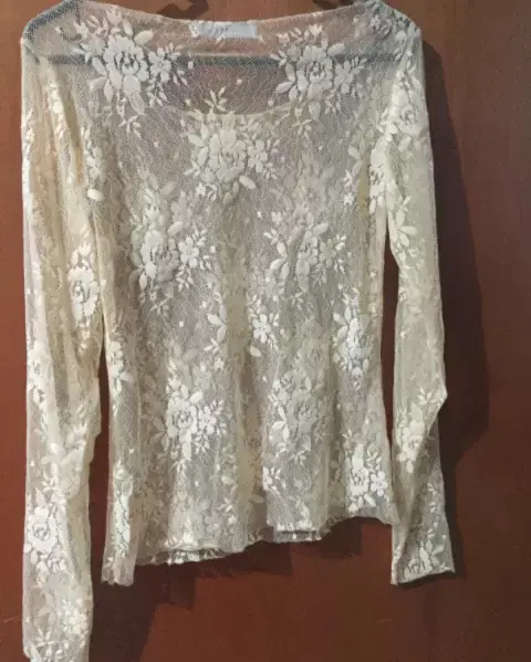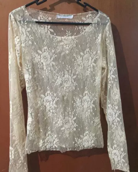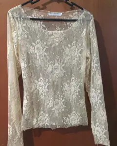 Delicada blusa de encaje color beige, que puede usarse de día o de noche muy versátil.