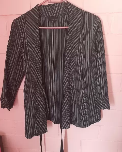 Blusa envolvente, de color negro, con gris, tipo de manga 3/4.
