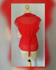 Blusa envolvente semitransparente color ROJO FUEGO, cuello pico c/escarolas zona frontal, 2 tiras laterales p/regular cintura, manga sisa y tank top mismo tono incluido p/usarse como corpiño. Talla 34 (REDUCIDA, da mejor a 30/32). Dimensiones cms: 36 hombro, 51 axila, 44 cintura (autoregulable), 54 zona baja, 60 largom Tank top: 46 axila, 48 zona baja, 37 largo (sin tirantes). 100% poliéster.