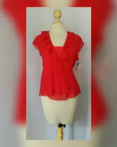 Blusa Envolvente con Escarolas. Blusa envolvente semitransparente color ROJO FUEGO, cuello pico c/escarolas zona frontal, 2 tiras laterales p/regular cintura, manga sisa y tank top mismo tono incluido p/usarse como corpiño. Talla 34 (REDUCIDA, da mejor a 30/32). Dimensiones cms: 36 hombro, 51 axila, 44 cintura (autoregulable), 54 zona baja, 60 largom Tank top: 46 axila, 48 zona baja, 37 largo (sin tirantes). 100% poliéster.