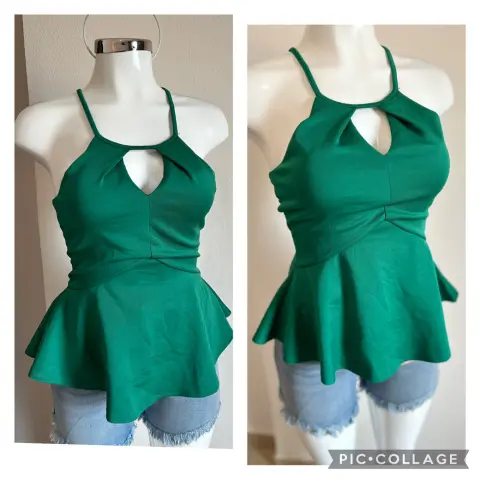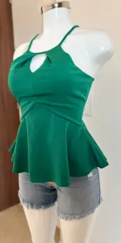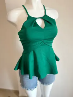 Blusa escotada. Blusa verde escotada con Olán debajo . Tiene doble tela en el pecho para poder usarla sin brassiere .