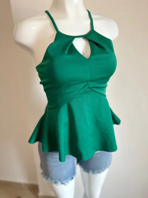 Blusa verde escotada con Olán debajo . Tiene doble tela en el pecho para poder usarla sin brassiere .
