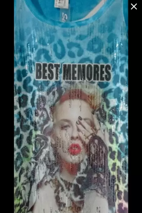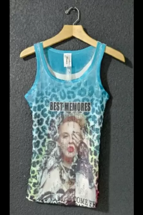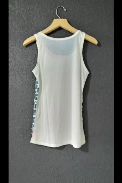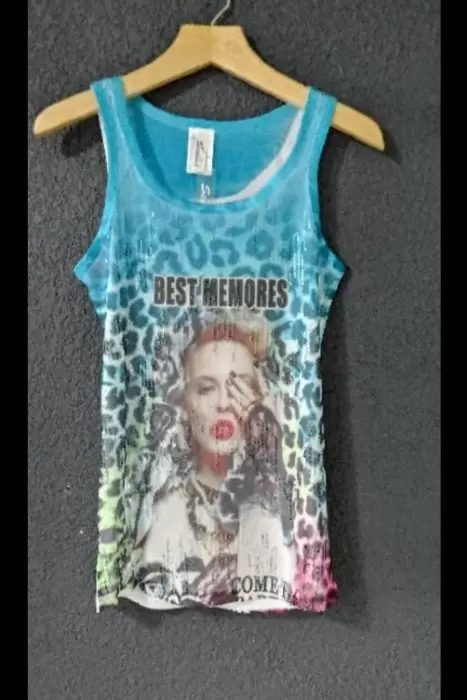 Blusita estampada Unitalla. Da de una talla S a una M, con pequeñas aplicaciones de Lentejuela, La parte de atrás es lisa en color blanco.