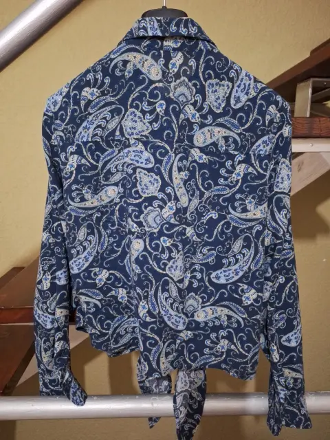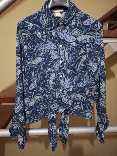 Blusa estampada en azul marino con detalles azul claro,con botones,manga larga, cintas para un ligero nudo al frente de largo un poco abajo de la cintura. Composición 100% biscosa, muy cómoda.