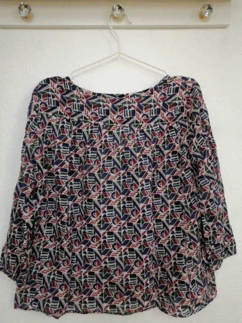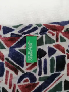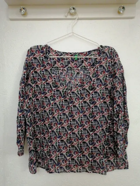 Blusa Benetton estampada con formas geometricas, tela delgada, fresca,manga larga. Talla mediana, amplia.