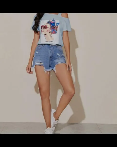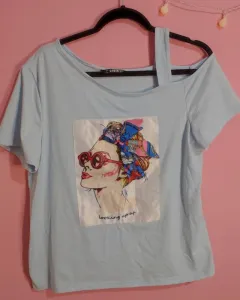 Blusa estampada con imagen, hombro normal y el otro es con un tirante. Es de tela fresca queda a un L y XL.