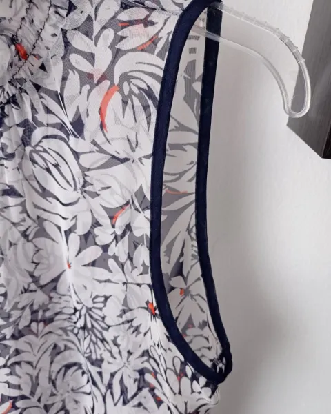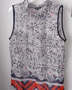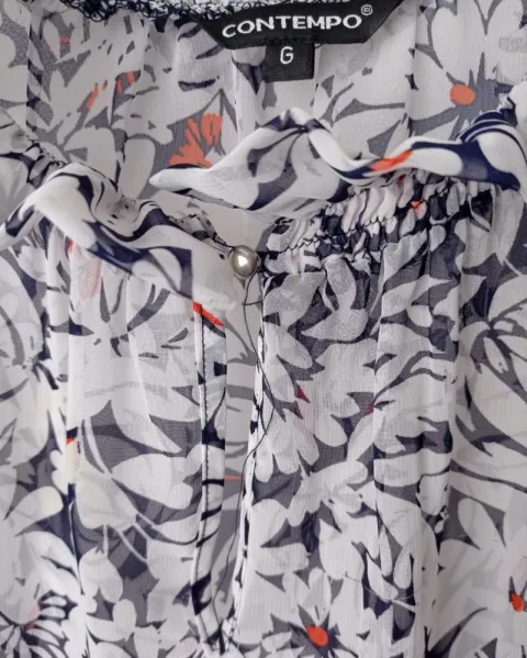 Hermosa blusa estampada con flores blancas con centro naranja y fondo azul.Tiende una coqueta escarola que te hará lucir dulce.Es de poliéster, muy ligera.Se puede llevar con un bra blanco o azul o si eres menos atrevida, puede usarse con un top blanco.Talla grande.Medidas: pecho 54 cm en el frente y 54 cm en la parte de atrás. Largo del frente 67 cm, largo de atrás 74 cm, hombro 7 cm, sisa 26 cm. Perímetro del cuello 53 cm.Muy combinable con unos buenos jeans. 👖
