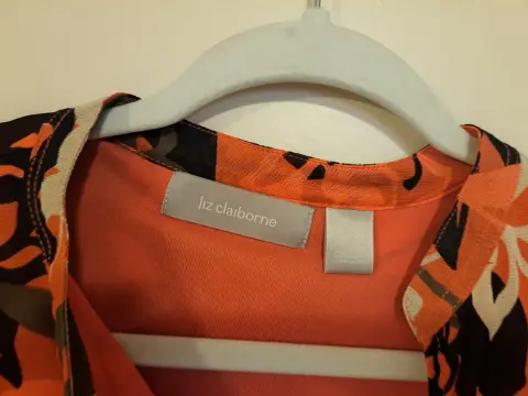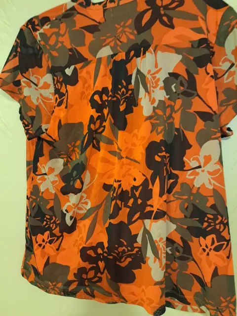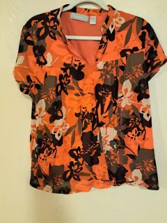 Blusa estampada color negro naranja blanco y verde militar con flores manga cortaLiz ClaiborneTalla Busto 59Largo 65