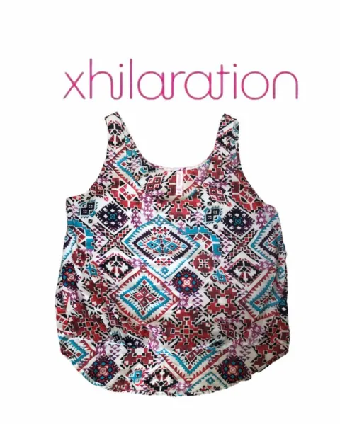 Blusa estampada XHILARATION. Camiseta de dama con estampado lde colores, talla M pero viene reducida, es talla M (viene reducida), y tiene resorte en la parte de enfrente y atras es larga, es totalmente nueva,