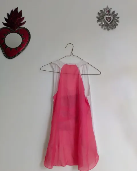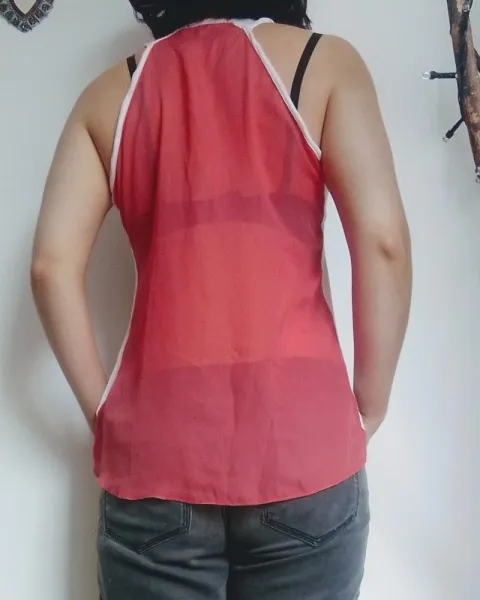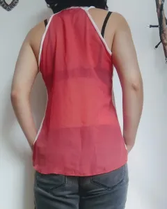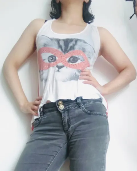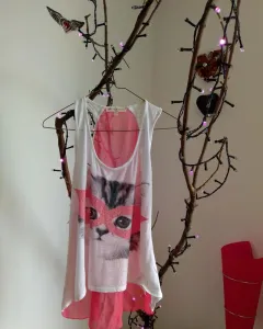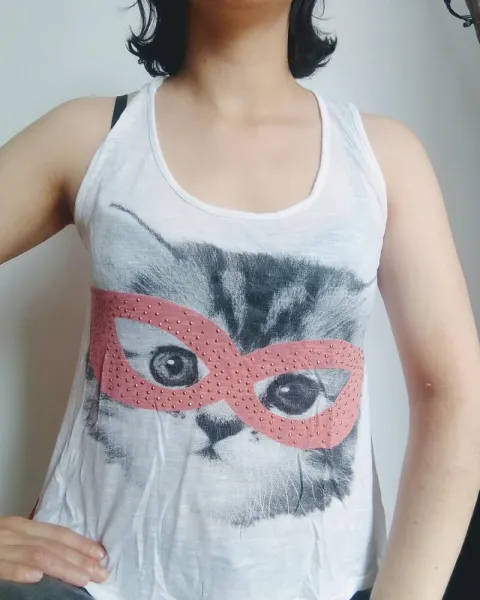 Blusa de tela delgada color blanca y en espalda color rojo (poliéster transparente), un poco más larga atrás, con aplicaciones de piedras de fantasía en estampado de gato.