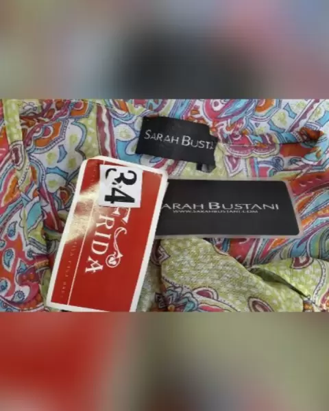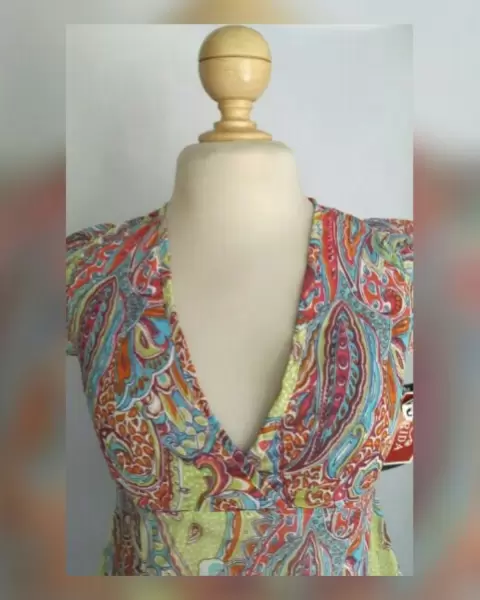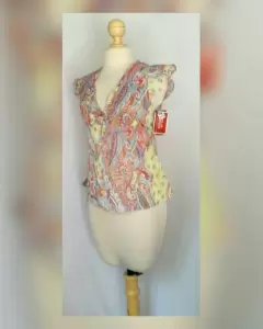 Blusa ligera estampado Paisley MULTICOLOR c/destellos DORADOS, cuello pico, manga cap y cinto integrado mismo tejido. Talla 34 (MUY REDUCIDA, da mejor a 28/30). Dimensiones cms: 28 hombro, 44 axila, 42 cintura, 61 zona baja, 60 largo, 16 largo manga. 100% poliéster. Para lavado en casa.
