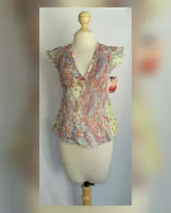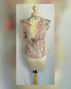 Blusa estampado Paisley con Cinto. Blusa ligera estampado Paisley MULTICOLOR c/destellos DORADOS, cuello pico, manga cap y cinto integrado mismo tejido. Talla 34 (MUY REDUCIDA, da mejor a 28/30). Dimensiones cms: 28 hombro, 44 axila, 42 cintura, 61 zona baja, 60 largo, 16 largo manga. 100% poliéster. Para lavado en casa.