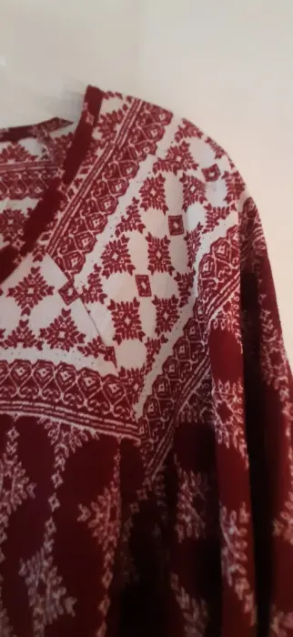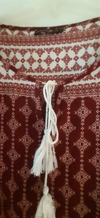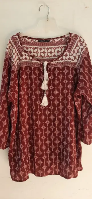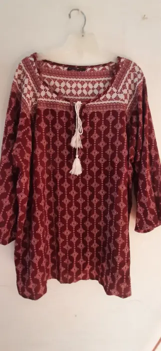 Blusa estilo boho talla 42. En color tinto, cuello redondo con detalle de moño de hilo. Manga 3/4 y holgada, tela ligera, combina peefecto con mezclilla