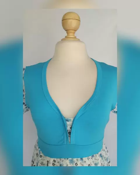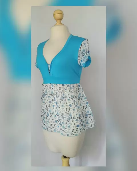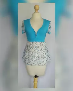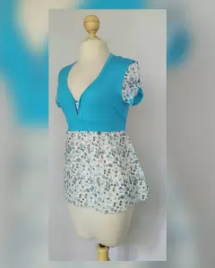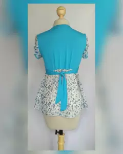 Blusa estilo campesino en color AZUL CAPRI y estampado floral fondo BLANCO OSTIÓN/AZULES, cuello joya, manga corta c/elástico y cinto integrado mismo tejido en cintura p/mejor ajuste. Talla G. Dimensiones cms: 39 hombro, 47 axila, 41 cintura, 64.5 zona baja, 62 largo, 11 largo manga. 95% poliéster, 3% viscosa, 2% elastano. P/lavado en casa. ***SIN DETALLES, SE USO SOLO 1 VEZ P/UN PAR DE HRS***SE ENTREGA LAVADA Y DEODORIZADA***