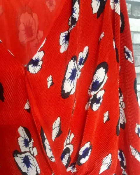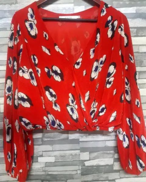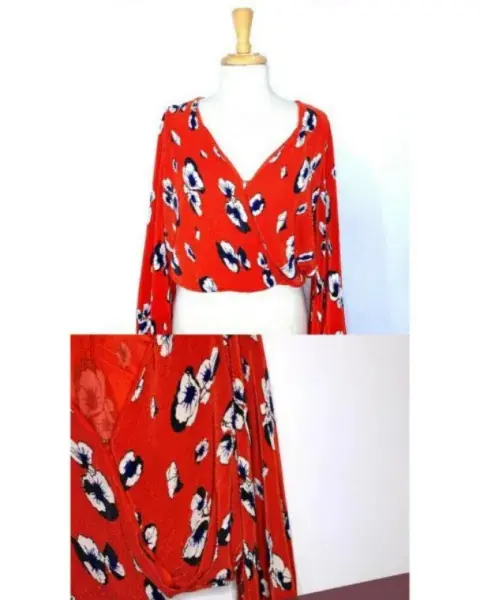 Elegante blusa estilo crop, tipo satin roja. Se compró en USA. Solo se usó una ocasión, tiene un mínimo detalle en el interior que al desvestir se rasgo con el arete. Se muestra en la última foto