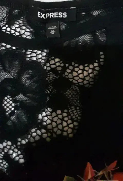 Blusa Express negra Talla L. Blusa marca Express color negra, estampado en flores al frente, con una abertura v, en la parte posterior es encaje negro (cómodo). Ideal para esta temporada de calor 🔥!