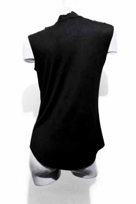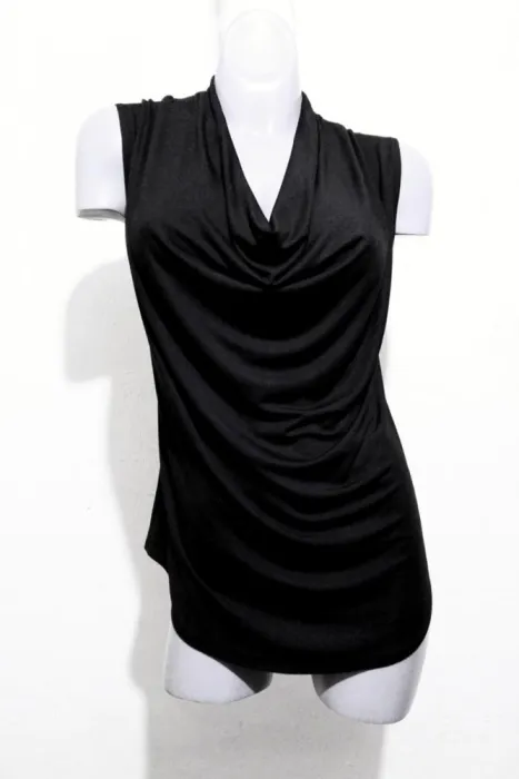 COLOR NEGRO, CUELLO DRAPEADO, STRETCH 100% RAYON, TALLA CHICA, MEDIDAS DE UNA CARA: AXILA A AXILA 45 CM (ESTIRA HASTA LOS 60), LARGO 66 CM.