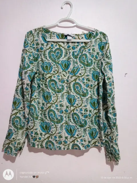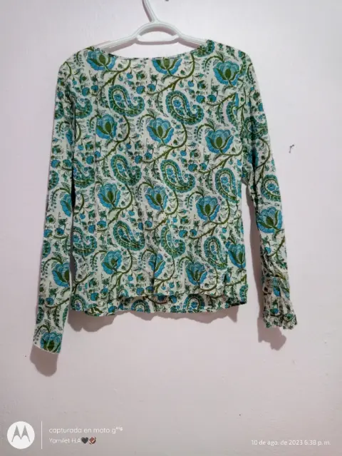 Hermosa Blusa floral de tela fresca, de manga larga con aberturas en estas, sin detalles, completamente nueva, en buen estado, cuello tipo V, con listones en la parte de enfrente por si gustan hacer un amarre, talla LPregunta sin compromiso