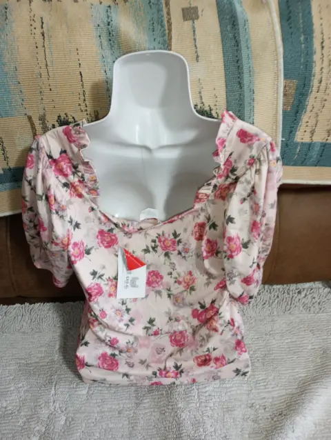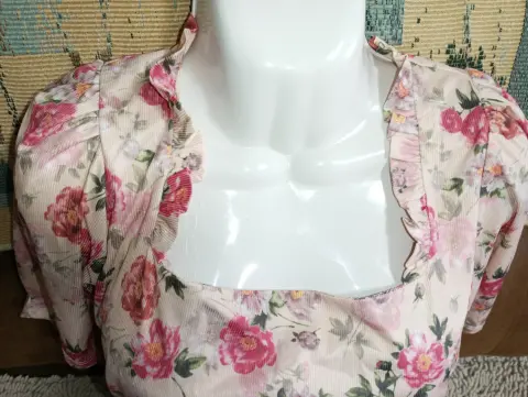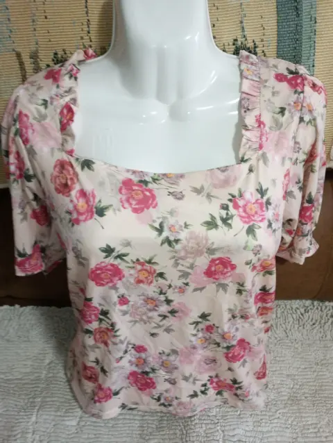 Hermosa blusa corta tipo crop top, cuello cuadrado con olanes, manga corta, tela super suavecita y fresca, estira un poco, estampado floral, cuenta con un pequeño detalle (un hoyito) el cual pasa desapercibido. Marcada como talla G pero da más a M. Muy hermosa.