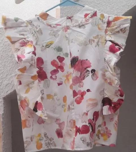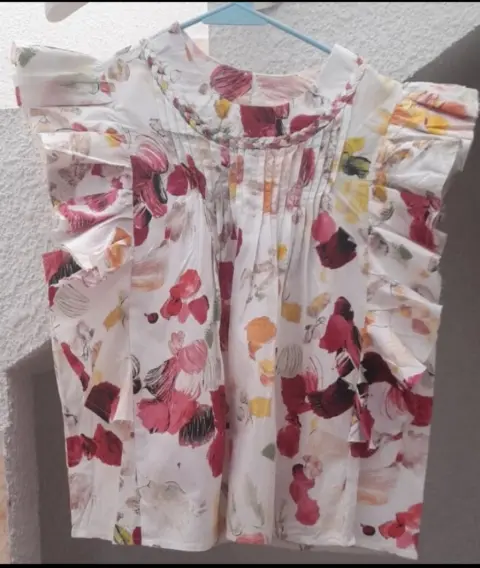 Blusa floreada con olanes, talla S, es de algodón,es nueva,no trae detalle,medidas, hombro a hombro-35, axila a axila-50, largo de la blusa-55.