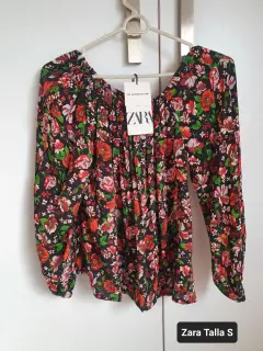 Blusa floreada, marca Zara, tela fresca, color negro con flores. Talla S. Con etiqueta 🏷