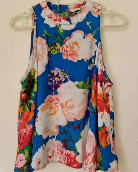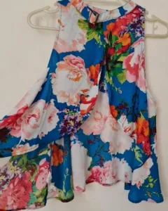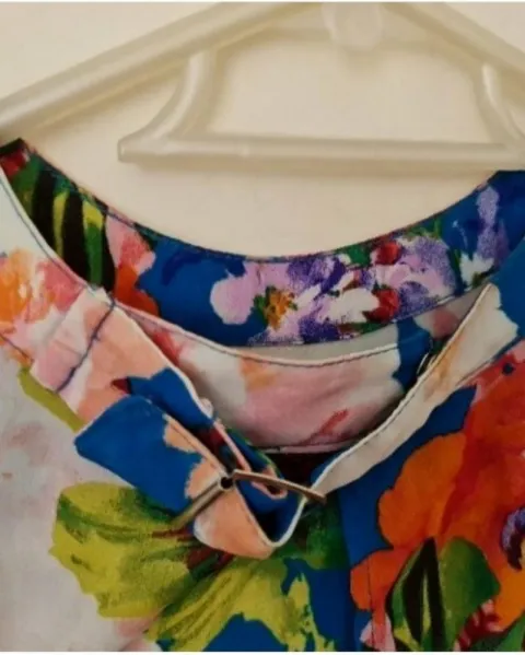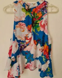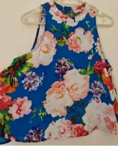Blusa floreada sensual!! ESCOTE espalda!!. SENSUALISIMA BLUSA FRESCA FLOREADA DE DISEÑADORA : REINA DIAZ!! BLUSA HOLGADA AL CUELLO TRAE DETALLE DE MINI CINTURON DECORATIVO,Y BROCHE DE PRESION!! LA.ESPALDA DEJA DESCUBIERTO CON LIGEROS OLANES DE LA MISMA TELA.DE LA BLUSA!! ESTA HERMOSA !!! NUEVA!!POR EL.CORTE HOLGADO PUEDE QUEDAR A LAS TALLAS:30,32,34!!