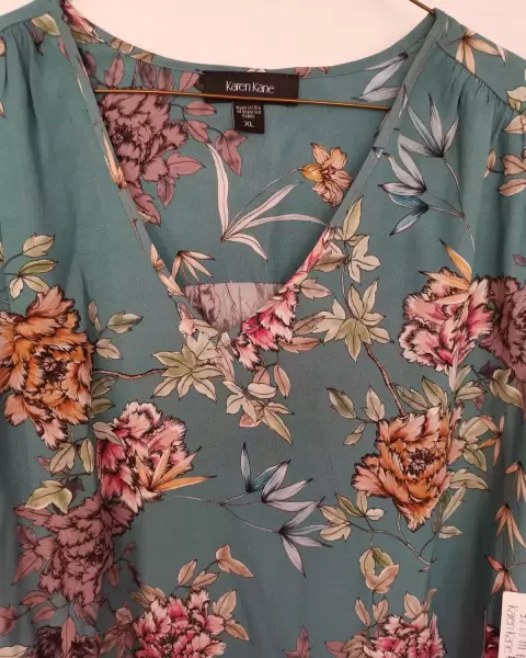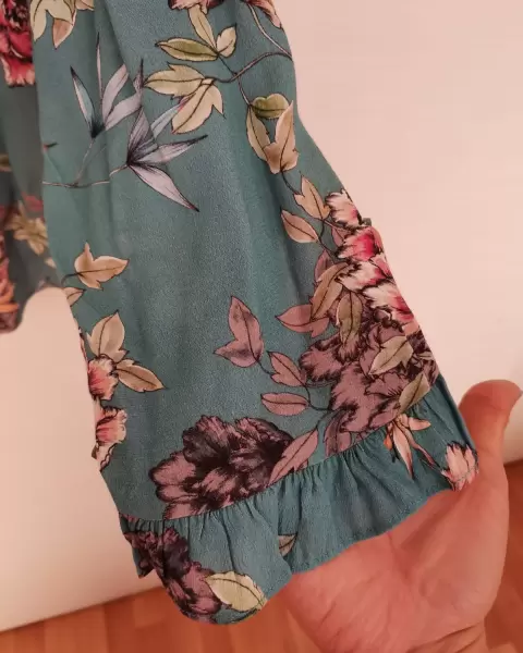 Blusa con flores color menta , manga larga que termina con un pequeño olan