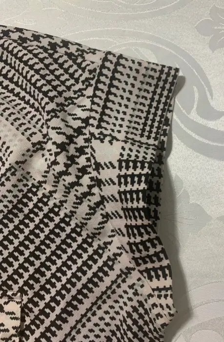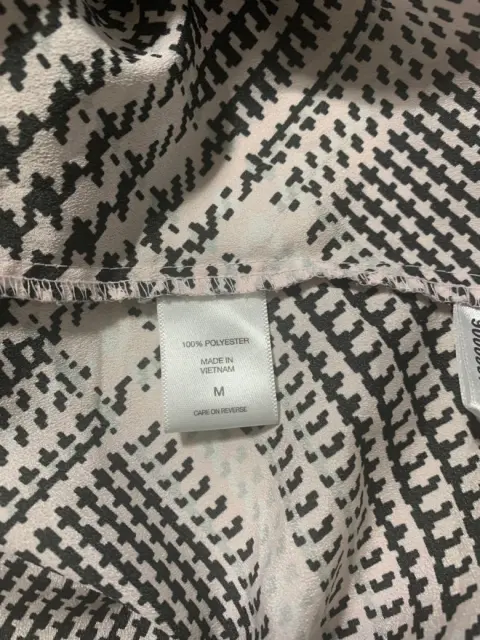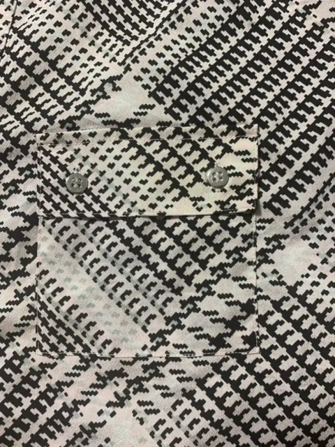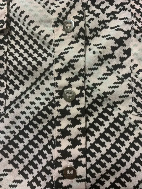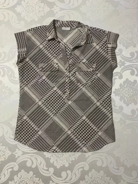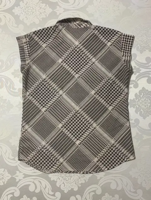 Blusa de manga corta, cuello formal, botones a medio pecho, tela ligera, estampado de pata de gallo.Medidas/ espalda: 44 cm, busto: 51 cm, cintura: 48 cm, largo: 68 cm.