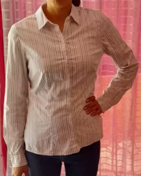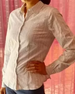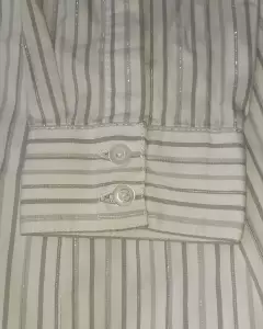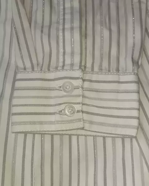 Bonita blusa formal de manga larga talla chica está en perfecto estado solo se usó un par de veces se aprecia mejor el color en la última foto es blanca con líneas grises y plateadas.