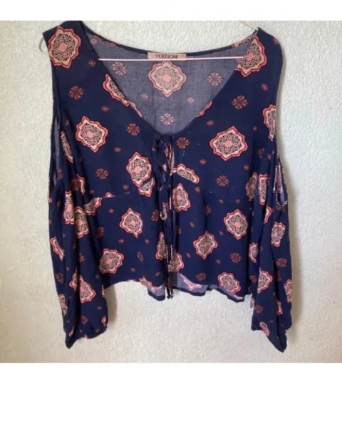 Blusa Vertiche con hombros descubiertos talla L, las mangas son largas y la tela es fresca, es blusa corta, es de uso