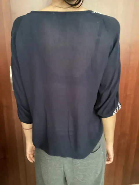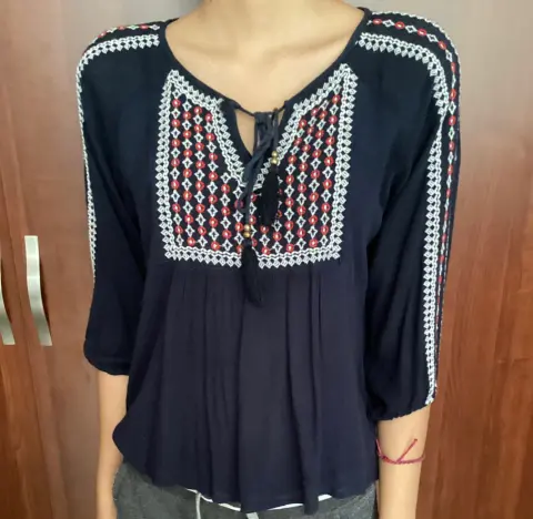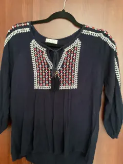 Blusa Fresca Talla S StopPreciosa blusa azul marino con bordado en pecho y mangas. Esta súper linda y fresca. El color es azul intenso, aunque en las fotos no se aprecia bien. Mangas 3/4. Poco uso y en perfecto estado.