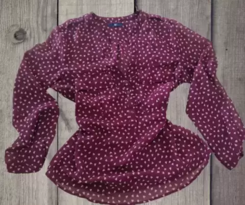 Blusa Gap. Blusa transparente color morado, con estampado de corazones talla chica marca GAP manga larga con 2 bolsitas al frente súper cómoda para el calor