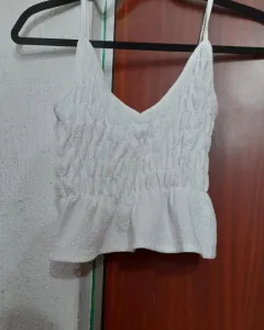 Es un tipo crop top con encaje enmedio y abajo tiene holanes es talla xs y no es usado solo me lo puse para una fiesta