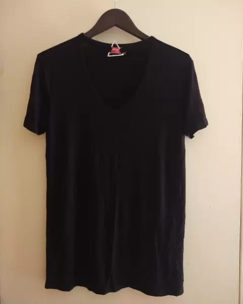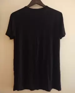 Blusa negra holgada con un detalle tipo gargantilla en forma triangular, metálica. Manga corta que se puede usar como vestido dependiendo tu estatura. La talla es S/CH, en muy buen estado, la tela es muy suave elástica, el color negro se conserva perfectamente bien sin decoloración, la tela es delgada pero no se transparenta a menos de que la estires mucho.