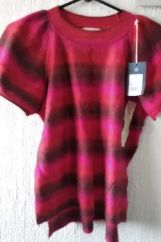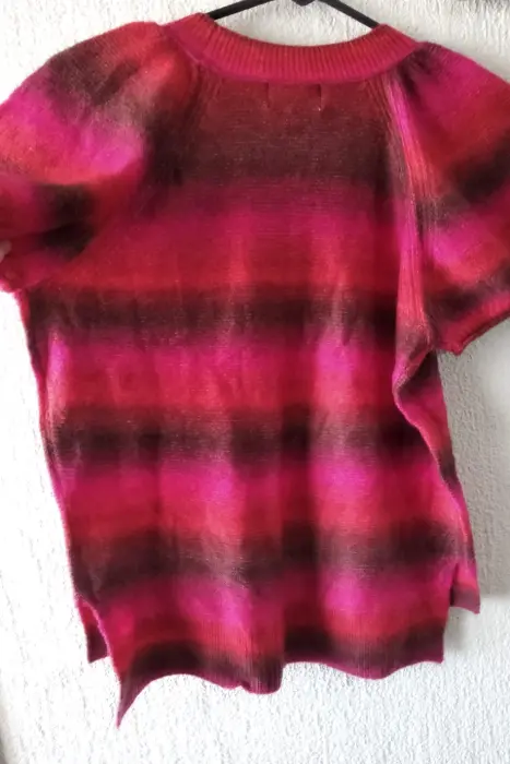 Bonito jersey de mangas abultadas con suaves y difusas rayas ombre en tonos rojos y rosas. Cuello redondo, mangas cortas y corte cuadrado. Primera imagen de referencia.
