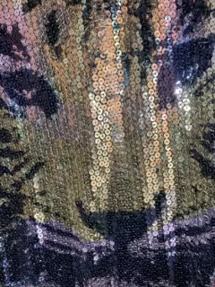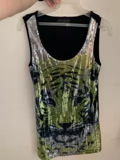 Es una blusa chica con lentejuelas que forman como la cara de un tigre o leon, muy bonita, solo la use 1 vez, es excelente estado, es chica, yo creo que es como para una fiesta, antro o algo así 👍🏼👍🏼👍🏼