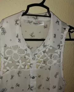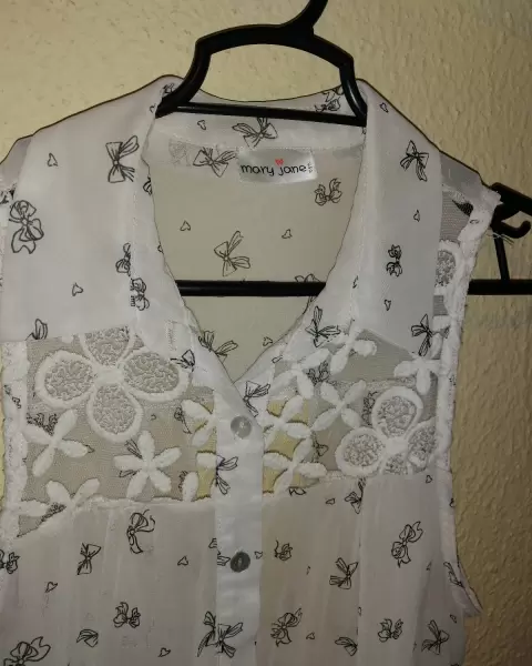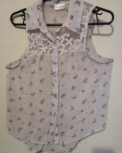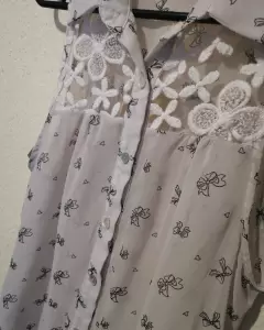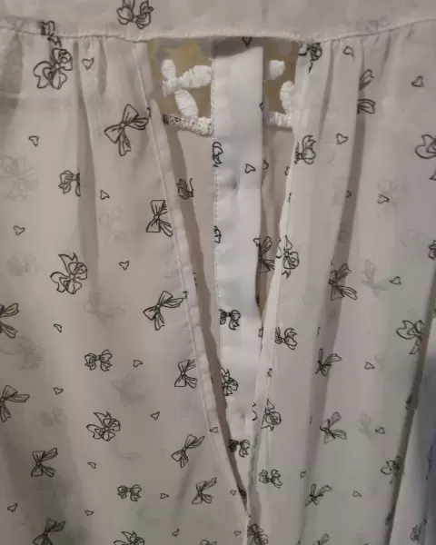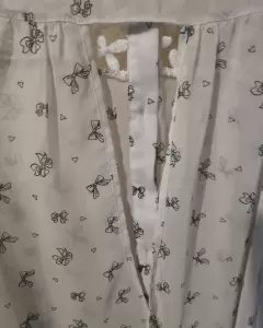 Es muy ligera y está en buen estado tiene escote en la espalda el estampado es de moños y es suave, queda muy linda y en estos días calurosos es perfecta.