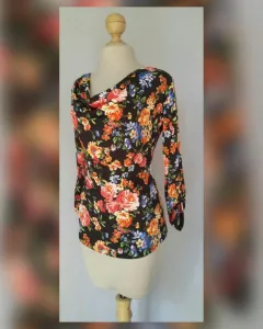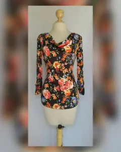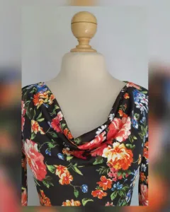 Blusa ligera c/estampado FLORAL base tono NEGRO ÉBANO y estampado floral MULTICOLOR, cuello drapeado y manga larga terminada en tira. Talla G. Dimensiones cms: 41 hombro, 52 axila, 42 cintura, 50 zona baja, 63 largo, 56 largo manga. 95% viscosa, 5% elastano. P/lavado en casa.***P/LA COMPOSICIÓN DE LA PRENDA, DA DE SI PERO NO P/SUBIR A LA SIG TALLA***