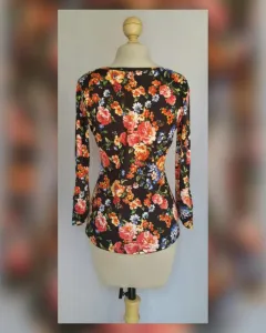 Blusa Ligera estampado Floral. Blusa ligera c/estampado FLORAL base tono NEGRO ÉBANO y estampado floral MULTICOLOR, cuello drapeado y manga larga terminada en tira. Talla G. Dimensiones cms: 41 hombro, 52 axila, 42 cintura, 50 zona baja, 63 largo, 56 largo manga. 95% viscosa, 5% elastano. P/lavado en casa.***P/LA COMPOSICIÓN DE LA PRENDA, DA DE SI PERO NO P/SUBIR A LA SIG TALLA***