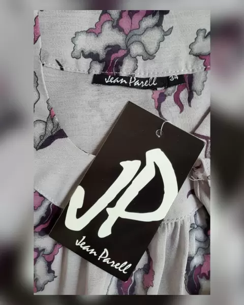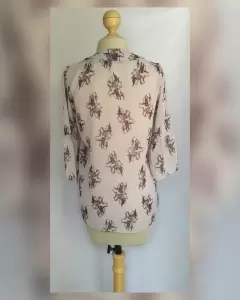 Blusa Ligera estampado Floral. Blusa ligera tipo gasa color GRIS ÁCERO con estampado floral en tonos MORADOS Y GRISES, cuello elíptico, manga 3/4 terminada en campana. Talla 34 (REDUCIDA, da mejor a 32). Dimensiones cms: 38 hombro, 50 axila, 59 zona baja, 70.5 largo, 44.5 largo manga. 100% poliéster. Para lavado en casa.