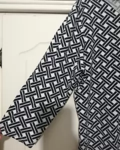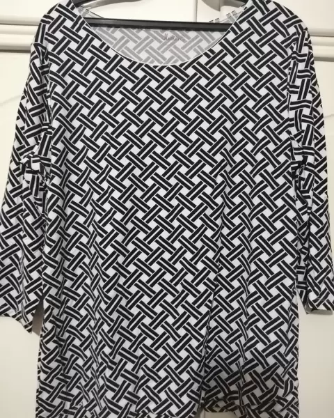 Linda blusa strech blanca con figuras negras talla xl pero queda para una talla L estira tela de licra manga 3/4