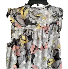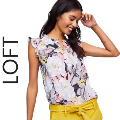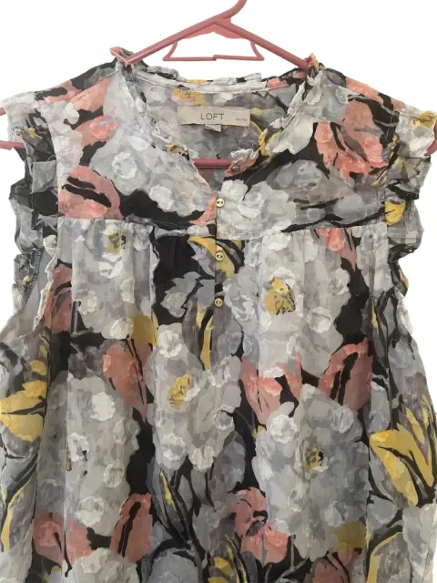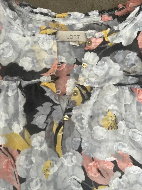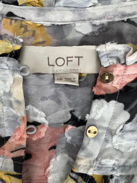 Blusa Loft floral. Hermosa blusa con textura, estampado floral en tonos gris y pastel. Con volados en mangas, botones dorados al frente. Con forro no se transparenta