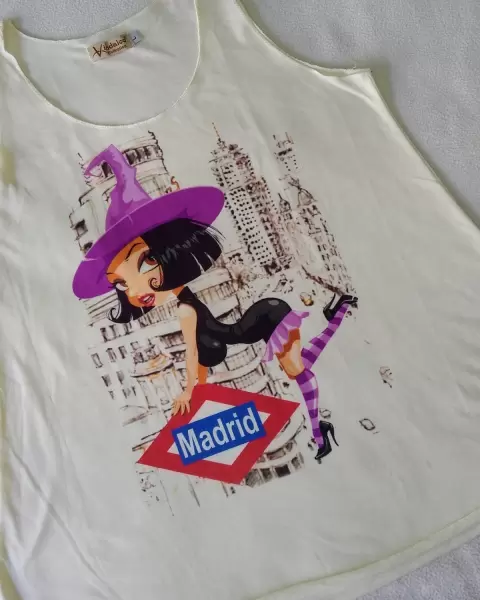 Blusa Madrid Witch. Hola chic's!!Blusa de manga corta nueva, muy linda de Madrid, nueva, con dibujo cool!Color perla clarito, forma excelente silueta en talla L, queda bien a MMedidas: Ax-Ax:47 Largo:63Estira muy poco.Visita mi closet!!!, y arma tu paquete con descuento 💞🤗
