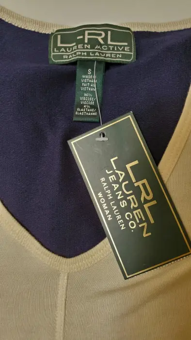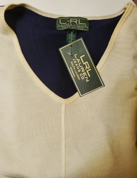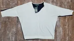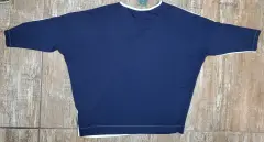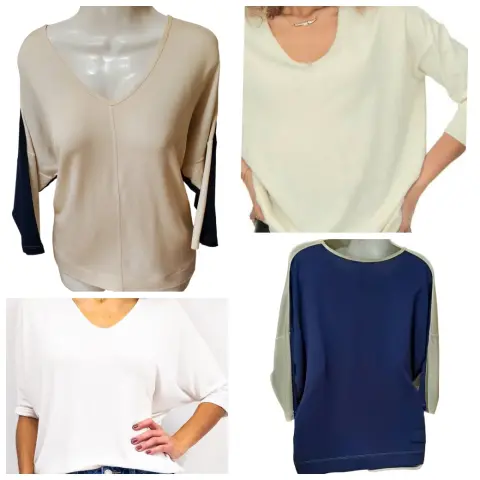 Blusa manga 3/4, dos colores beige de frente y la espalda azul marino. Viene amplia, talla s, le queda tambien a una talla mediana