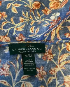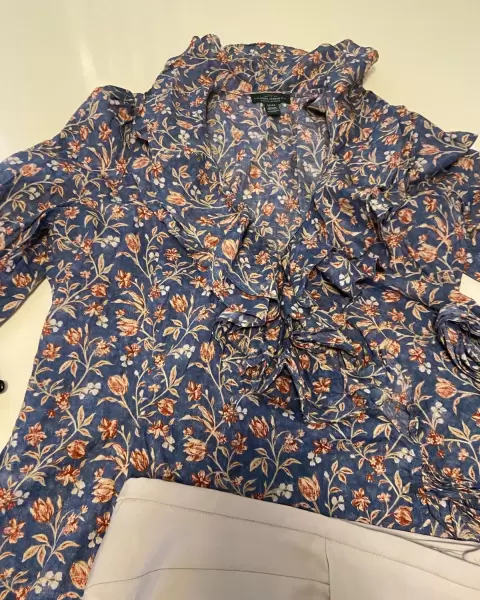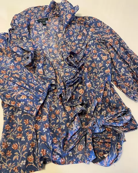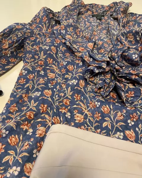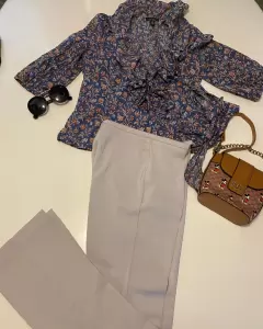 Blusa print flores en color beige con marrón, olanes en cuello, manga 2/4, cinta para amarrar en cintura.