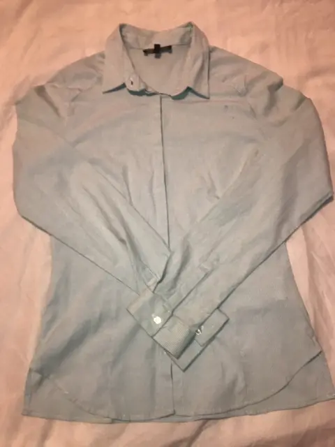 BLUSA MANGA LARGA, RALLADA AZUL CLARO, MARCA METRÓPOLIS DE SUBURBIA. CORTE SLIM STRETCH