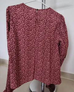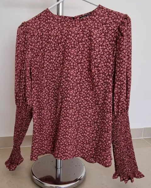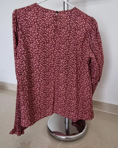 Blusa campesina color rosado con café es floreada. Las mangas tienen resortes así que que son ajustadas.