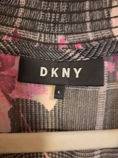 Blusa Manga larga DKNY. Blusa Manga larga de tela delgada con franjas de encaje negro, en color de cuadros negros con beige y con flores blancas con grises y fiushasSe amarra al frente.ancho 55cmLargo 71 cmMarca DKNY