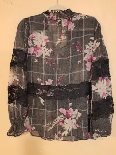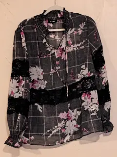 Blusa Manga larga de tela delgada con franjas de encaje negro, en color de cuadros negros con beige y con flores blancas con grises y fiushasSe amarra al frente.ancho 55cmLargo 71 cmMarca DKNY