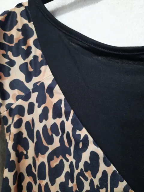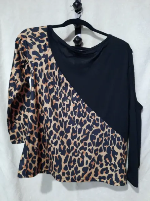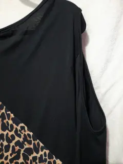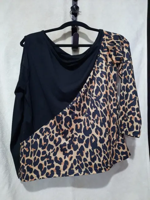 Blusa manga larga negra y animal print. Blusa de manga larga mitad negra mitad animal print con un hombro descubierto.